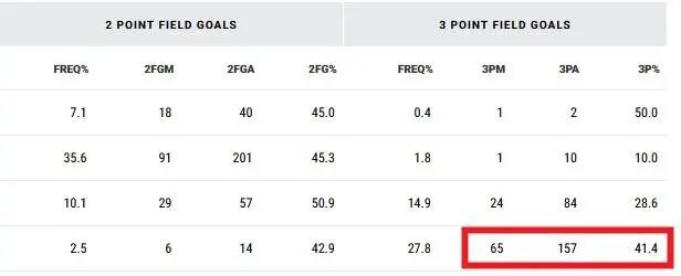 2、空位三分率。惯例赛天然35.8%三分率相对一般,不外防御东谈主处于6英尺以上的空位下三分率41.4%(157投65中)。