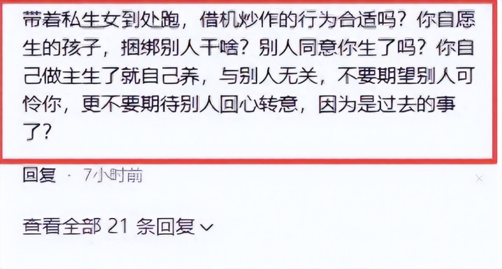但反对的声息相通很大。许多东说念主认为,孩子是无辜的,不应该从小就被放在镜头前,成为母亲流量变现的用具。还有东说念主认为,黄一鸣明明知说念对方不会公开承认,却一次次主动系结话题,铺张孩子和已往的厚谊,这么的边幅并不体面。