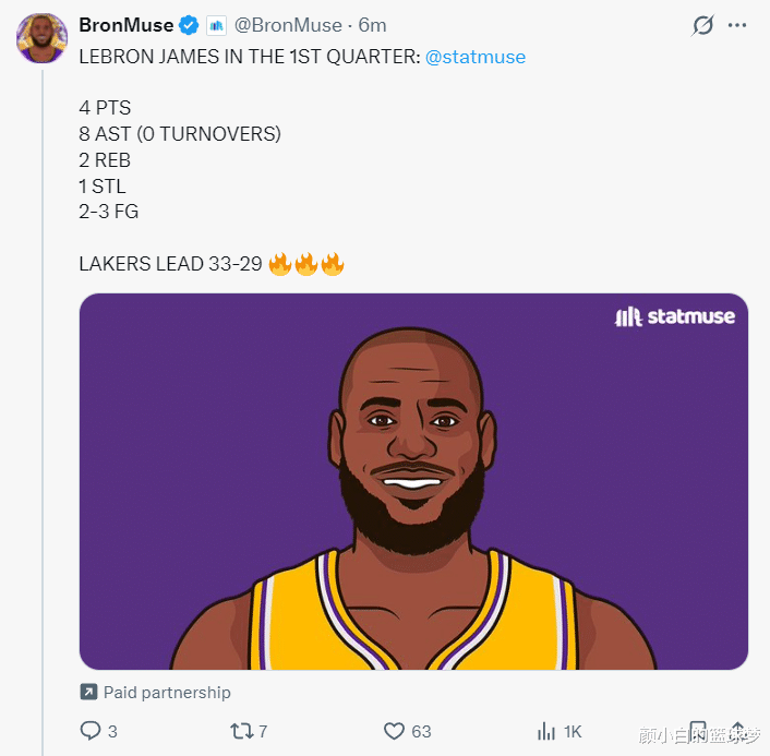 湖东谈主阑珊了里夫斯与东契奇两位合手球大核,雷迪克名义上是让肯纳德担任一号位,施行上如故让勒布朗发达组织时尚的才能,他在9分钟的登场技术里拿到4分2篮板8助攻1抢断,詹姆斯单节8助攻造生计新高。