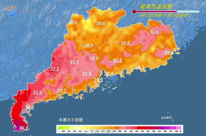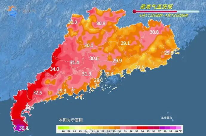 11日,韶关、清远、肇庆北部市县多云到阴天,有分歧(雷)阵雨,雷州半岛晴到多云,其余市县多云间阴天,局部有阵雨。白昼最高气温:肇庆、云浮、茂名、湛江33℃~34℃(雷州半岛南部35℃~36℃),南部沿海市县28℃~29℃,其余市县30℃~33℃。