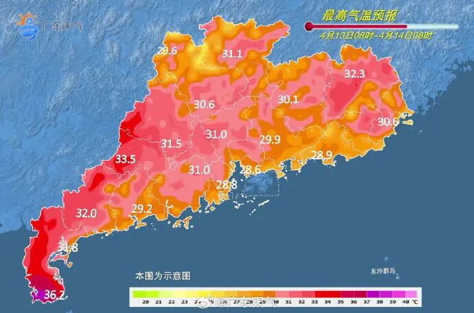 14日,韶关、清远、肇庆北部市县多云到阴天,有分歧(雷)阵雨,雷州半岛晴到多云,其余市县多云。白昼最高气温:肇庆、云浮、茂名、湛江33℃~34℃(雷州半岛南部35℃~36℃),其余大部分市县30℃~33℃。