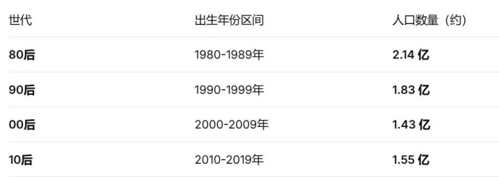 看一组东说念主口数据:80后约2.14亿,90后约1.83亿,00后约1.43亿,10后约1.55亿。从80后到00后,年轻一代东说念主口数目一代比一代少。喝茅台的主力在减少,能支执高端白酒的年轻群体在萎缩,曩昔销耗基数只会越来越小。