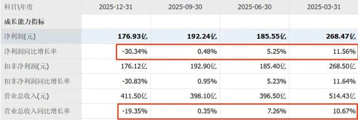 年度数据是效果,2025年四个季度的逐季数据,是茅台功绩逐级下滑的齐全经过,看完更能判辨,负增长不是无意,是势必。