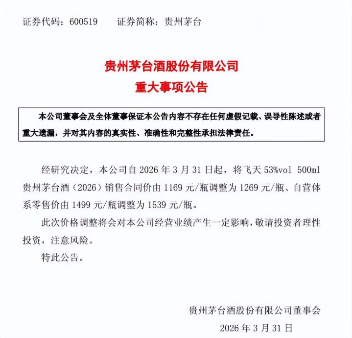 茅台在2026年3月底放出重磅音问:飞天茅台慎重加价。53度500ml飞天,出厂价从1169元涨至1269元,单瓶涨100元,涨幅8.6%;自营零卖价从1499元涨至1539元,单瓶涨40元,涨幅2.7%。