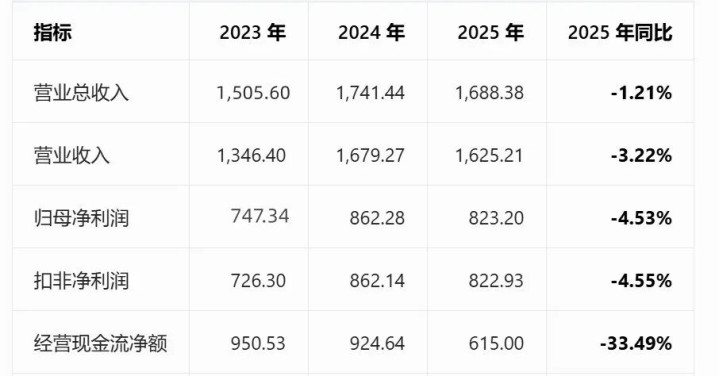 但2025年财报奏凯让阛阓逍遥。营业总收入1688.38亿元,同比下降1.21%;归母净利润823.20亿元,同比下降4.53%;蓄意现款流净额暴跌至615亿元,同比大跌33.49%;货币资金从1423.87亿元缩减至1264亿元,同比减少11.23%。