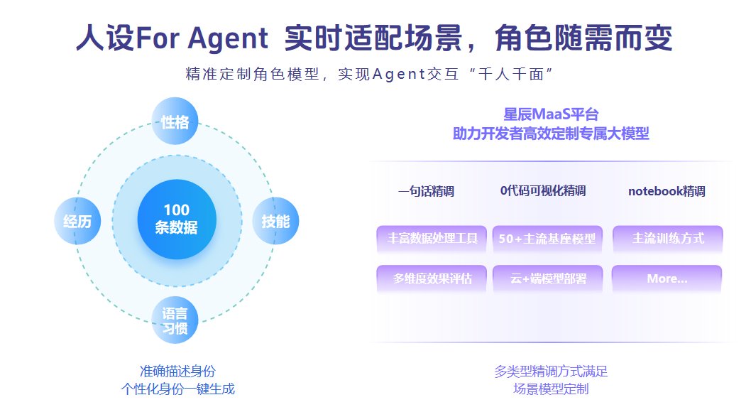 通过星辰MaaS的一句话精调模式,只需通过 “性格、资格、手段、言语民风” 几个维度的精确描述,系统即可生成100条场景数据,自动定制场景的扮装模子,驱散Agent交互的千东说念主千面,除了一句话精调,星辰MaaS基于高效的器用链+丰富的基座模子,还提供0代码可视化精调、notebook精调,得志Agent各个门径的成果精调,提高成果、效用的同期缩小资本,助力诈欺范畴化增长。