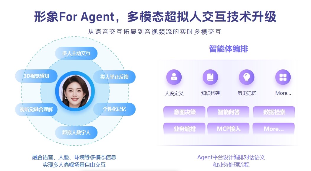 多模态超拟东说念主交互工夫的升级不错匡助企业,快速打造专属企业数字形象代言东说念主,塑造和解、生动的品牌形象,积淀品牌钞票,驱散品牌传播;同期,驱散降本增效,赋能业务创新与全球化拓展。更蹙迫的是,具备心扉与温度的交互神情,好像权贵提高用户粘性,络续驱动业务增长。