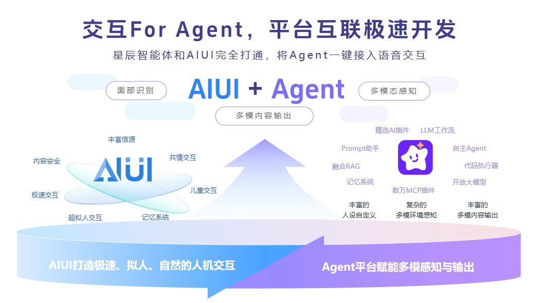 本次发布会上,星辰智能体平台和AIUI平台驱散统统买通,让Agent一键接入语音交互,在AIUI“听懂请示、意会意图、履活动作、语音反馈”基础之上,衔尾智能体让交互更个性化,救援多模态感知和输出。