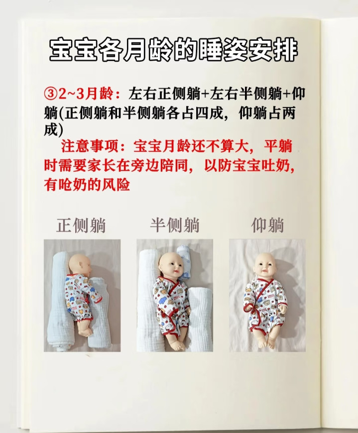 到了两个月,宝宝驱动变得“不安天职”了,头也驱动心爱扭来扭去。这时刻,单纯的正侧躺还是不够了,我们要引入半侧躺。