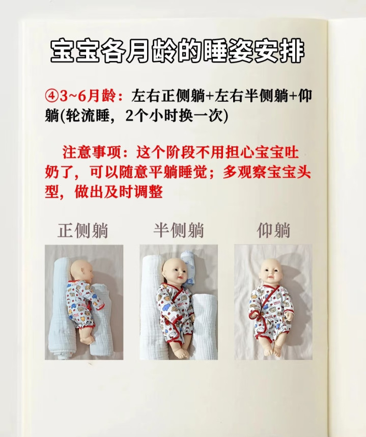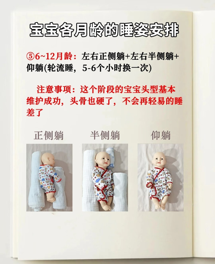 你会发现,这个阶段宝宝驱动学翻身了,睡觉姿势千奇百怪。这时刻我们不需要强行固定宝宝,而是要作念到“看头型,调睡姿”。