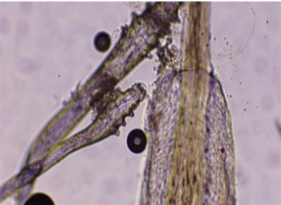 显微镜下,患者睫毛上的螨虫(白圈内)明晰可见。 病院供图