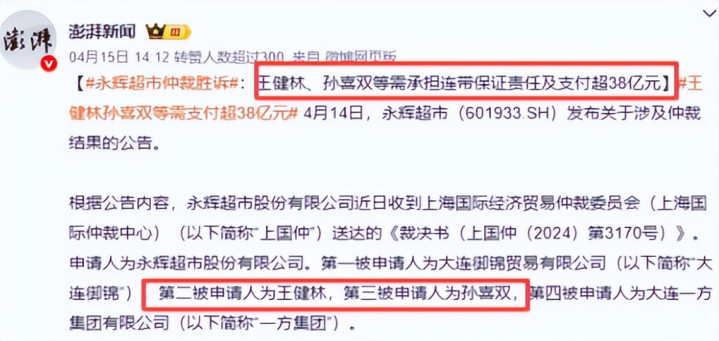 永辉超市仲裁胜诉了,这代表着王健林和孙喜双要承担连带背负38亿元多。