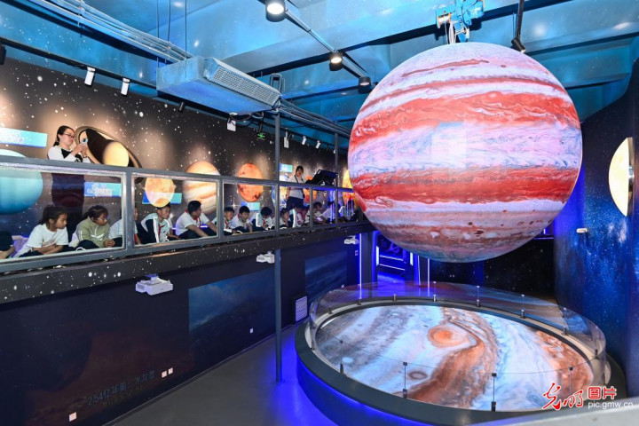 2026年4月11日,在山东省青州市东谈主工智能学习体验中心,学生们听使命主谈主员训诲航天常识。(王继林摄/光明图片)