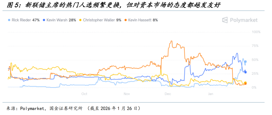 鲍威尔即便辞去主席职务,也可能留任好意思联储理事以制衡行政权柄的浸透。在此配景下,特朗普昭示哈塞特离联储主席渐行渐远,而愈加倾向市集收受度更高的东说念主选,但不细目性也变得更大,上周末照旧凯文·沃什(Kevin Warsh),这周末又换成了里克·里德尔(Rick Rieder)。肉眼可见的是,特朗普的新联储主席东说念主选对成本市集而言是“越来越友好”。