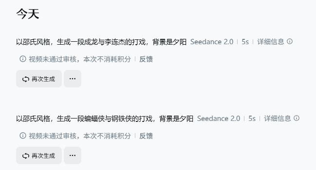 此外,新京报贝壳财经记者在测试中发现,波及名东说念主或者有名IP版权的视频生成,现时在即梦平台上是有所松手的。如新京报贝壳财经记者在最运转想要生成李连杰与成龙,或者蝙蝠侠与钢铁侠的打戏,但被辅导称“视频未通过审核,本次不用耗积分”。