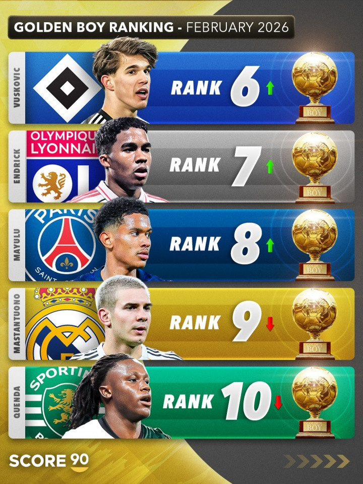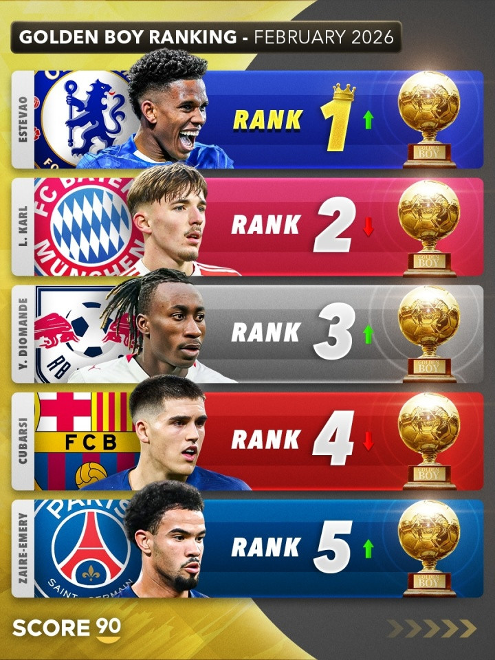 直播吧02月28日讯Score90给出了2026年金童奖2月份最新名次预计,埃斯特旺升至榜首,卡尔第二,时时彩app官方下载迪奥曼德升至第三。